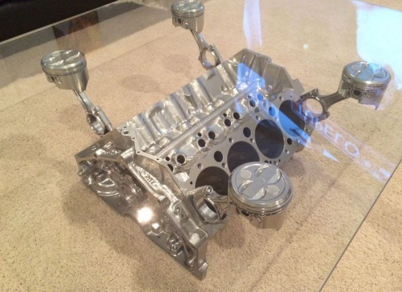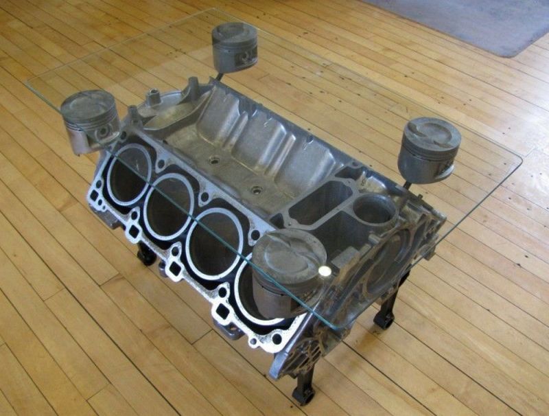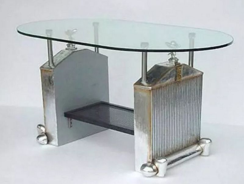 В отельную линейку следует выделить журнальные столики из различных автозапчастей со стеклянными столешницами.