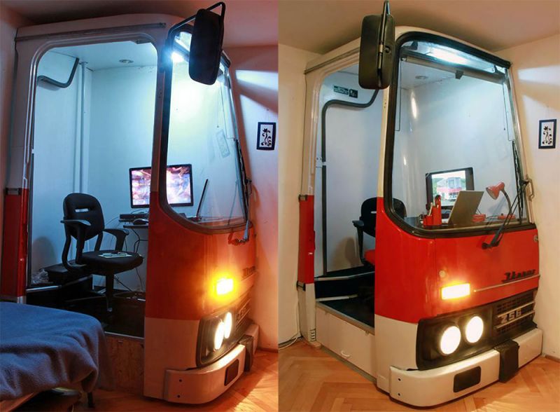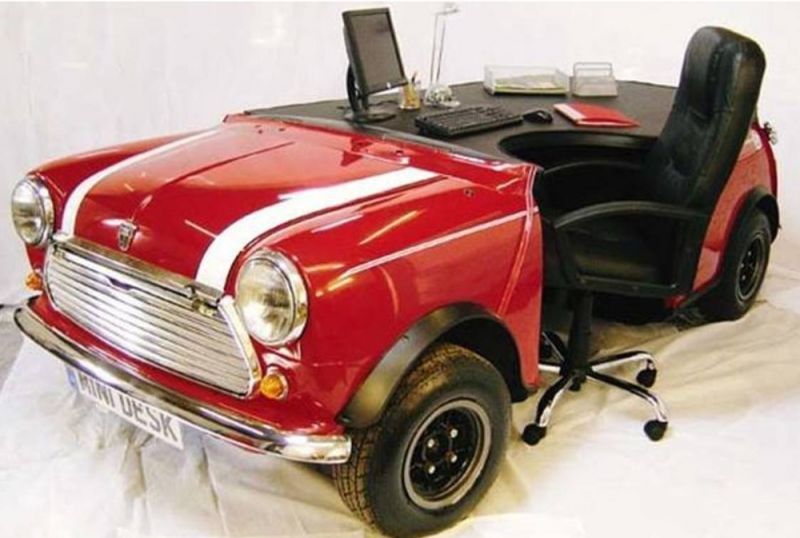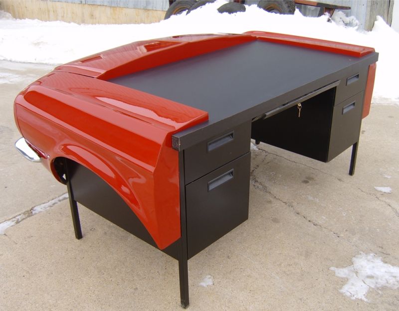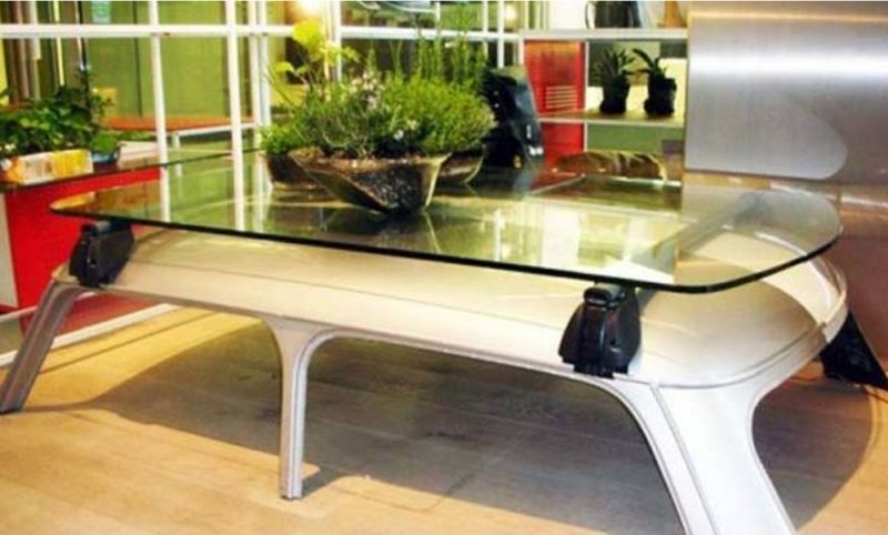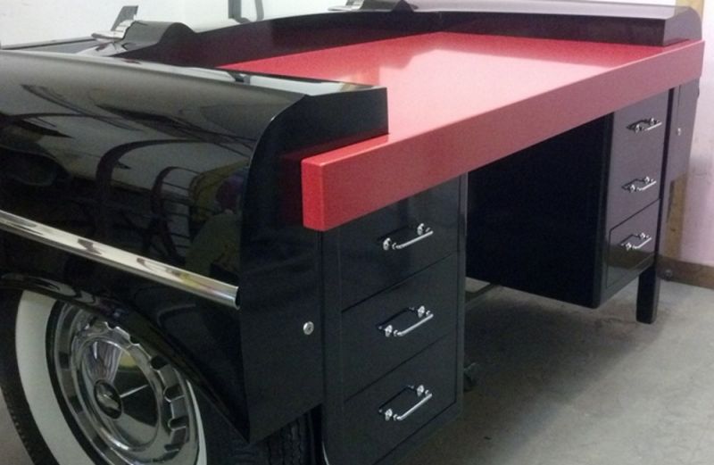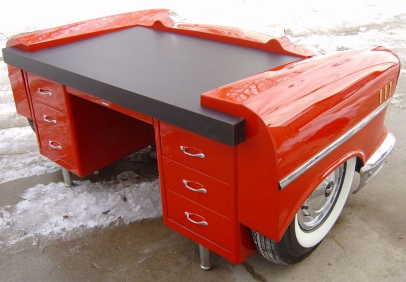 Разумеется, подобная мебель не годится для жилых помещений, но может придать особый колорит любому автосалону или автомастерской, а также офисам компаний, каким-то образом связанных с автомобилями. Для изготовления столов для ресепшена или офисных столов идеально подходят капоты и задние части автомобилей.