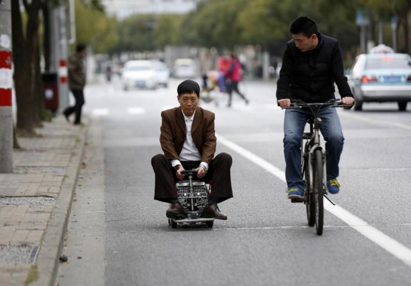 60-летний Сюй Чжиюнь едет на самодельном мини-автомобиле по улице Шанхая. Размеры данного транспортного средства составляют 35х40 см, а объем двигателя с пятью передачами – 77 куб. см.