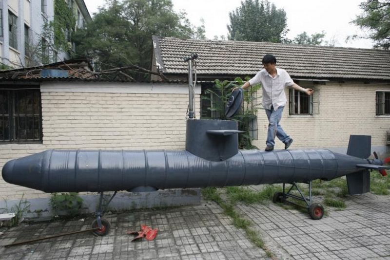 Изобретатель-любитель Тао Сянли стоит на верху самодельной подводной лодки во дворе дома в Пекине. Хотя подлодка была изготовлена из металлических бочек, она полностью функциональна и укомплектована перископом, резервуарами для контроля глубины, электродвигателями и двумя гребными винтами.