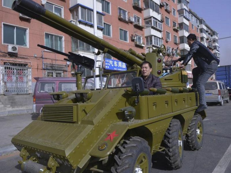 Изобретатель по имени Чжан, сидит в самодельном броневике на улице г. Шэньян в провинции Ляонин. Пушки могут стрелять пейнтбольными шариками и дымовыми шашками.