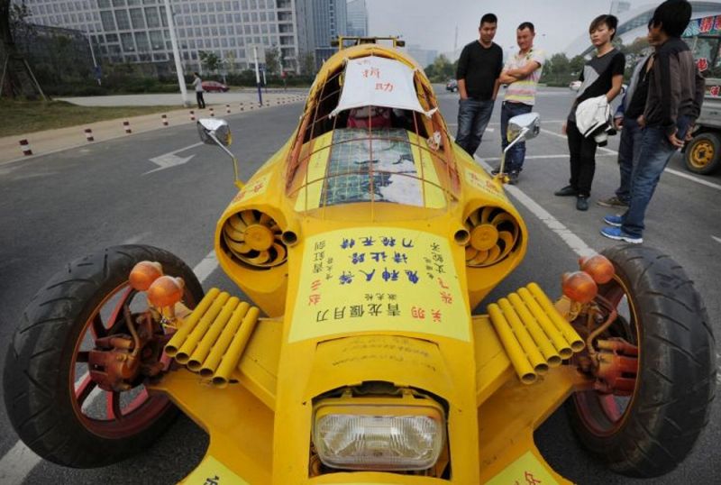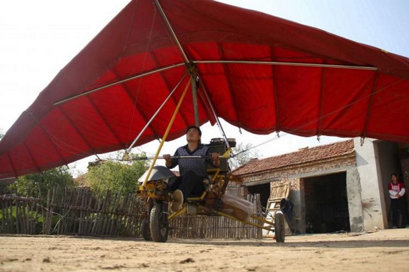 30-летний Чжан Хайон из г. Бинчжоу в провинции Шаньдун за 5 месяцев построил лететельный аппарат из автомобильных запчастей б/у и брезента, потратив $1312,8.