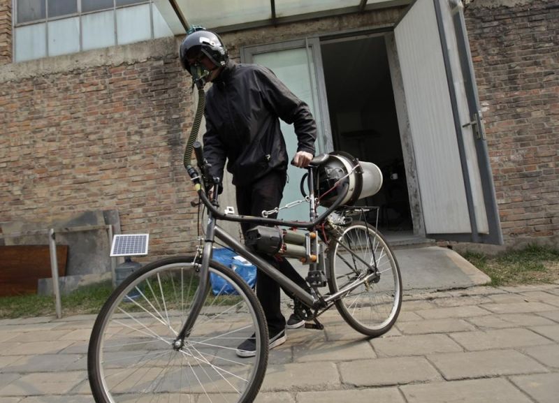 Художник Мэтт Хоуп выкатывает воздушно-фильтрационный велосипед из своей студии в Пекине. Разработанная им система фильтрации позволяет дышать чистым воздухом во время езды по загазованным выхлопными газами улицам.