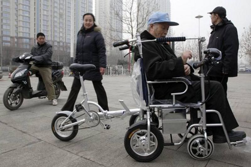 83-летний Чжан Юнгун разработал гибрид кресла-коляски и велосипеда.
