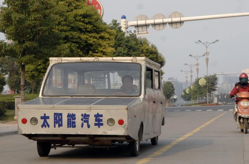 54-летний изобретатель-самоучка Чэнь Шунгуй из г. Цзинцзян в провинции Цзянсу управляет самодельным электромобилем на солнечной энергии, который может развивать скорость до 45 км. Его создание потребовало $19485 и 13 месяцев работы.