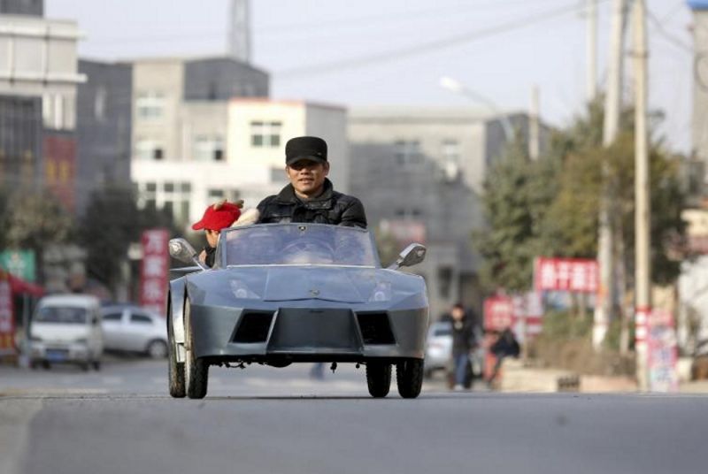 50-летний фермер Го едет на копии Lamborghini со своим внуком по г. Чжэнчжоу в провинции Хэнань. Стоимость самоделки составила $821.