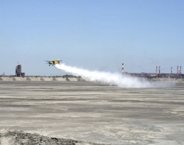 В цехе хвостового хозяйства обогатительной фабрики Лебединского ГОКа ведутся сезонные работы по пылеподавлению. В этих целях на протяжении нескольких лет Лебединский ГОК успешно применяет не только наземную поливооросительную технику, но и средства малой авиации.