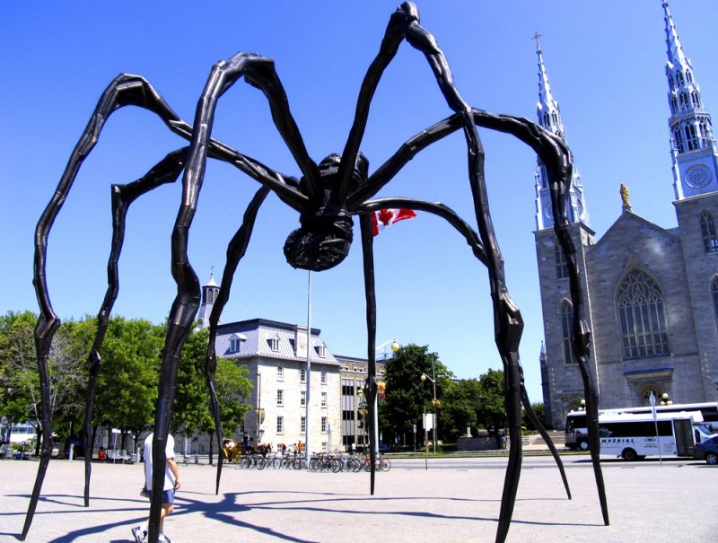 7. Maman (фр. Мать) изображает мать-паучиху. Скульптура установлена в 1999 году в Национальной галерее Канады в городе Оттава. Размеры: 9271 x 8915 x 10236 мм. Материал – нержавеющая сталь и бронза. В металлическом мешке находятся 26 мраморных яиц.