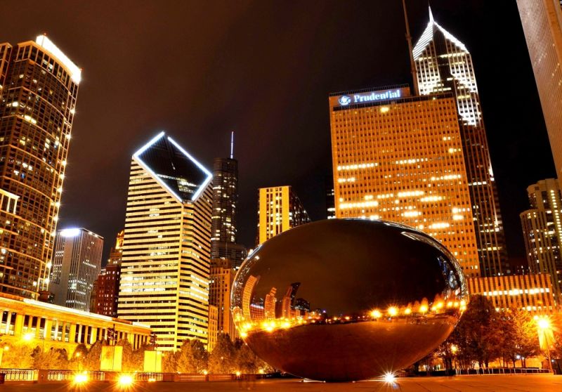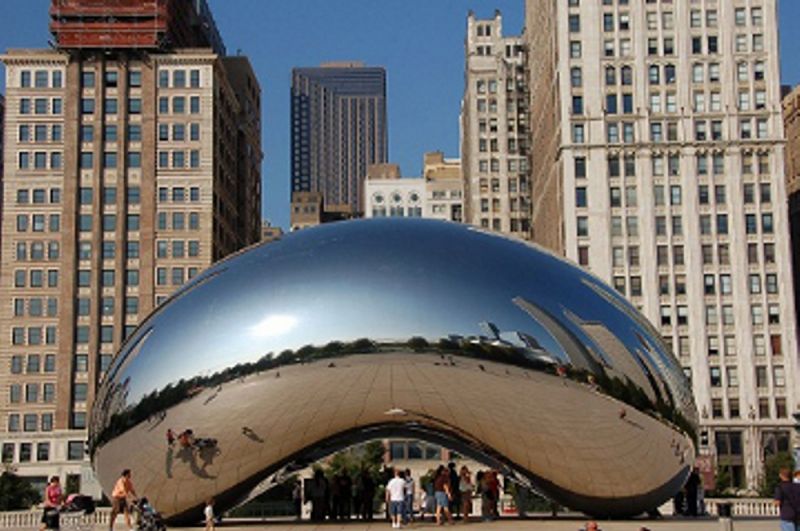 4. Cloud Gate (Облачные врата) установлены в Миллениум-парке в городе Чикаго в США в 2006 году. Размеры: высота – 10 метров, длина – 20 метров и ширина – 13 метров. Вес – 100 тонн, материал – 168 листов из нержавеющей стали. Ввиду кривой зеркальной поверхности без видимых швов, туристам нравится делать на их фоне селфи.