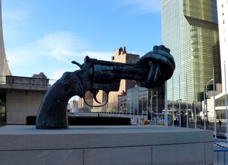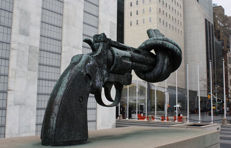 2. Non-Violence (Нет насилию), скульптура установлена возле штаб-квартиры ООН в 1985 году в память об убитом музыканте Джоне Ленноне. Также 22 копии установлены в разных странах, включая 12 копий в разных городах Швеции.